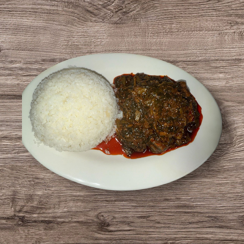 Cassava leaf with stew okra, lamb, fish, and palm oil served with white rice.