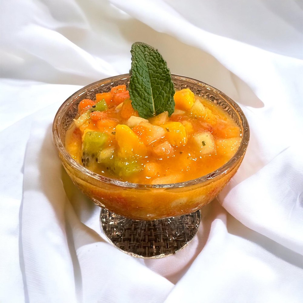 Refresh your senses with Our Signature Salad de Fruit a vibrant medley of tropical delights like juicy mango chunks, sweet pineapple, ripe papaya, and fresh strawberries, lightly kissed with lime zest and a hint of mint for pure, natural sweetness.