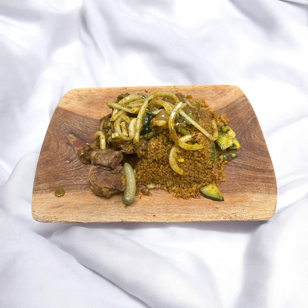 Lamb with rice & stewed vegetables onions sauce with exotic rice.