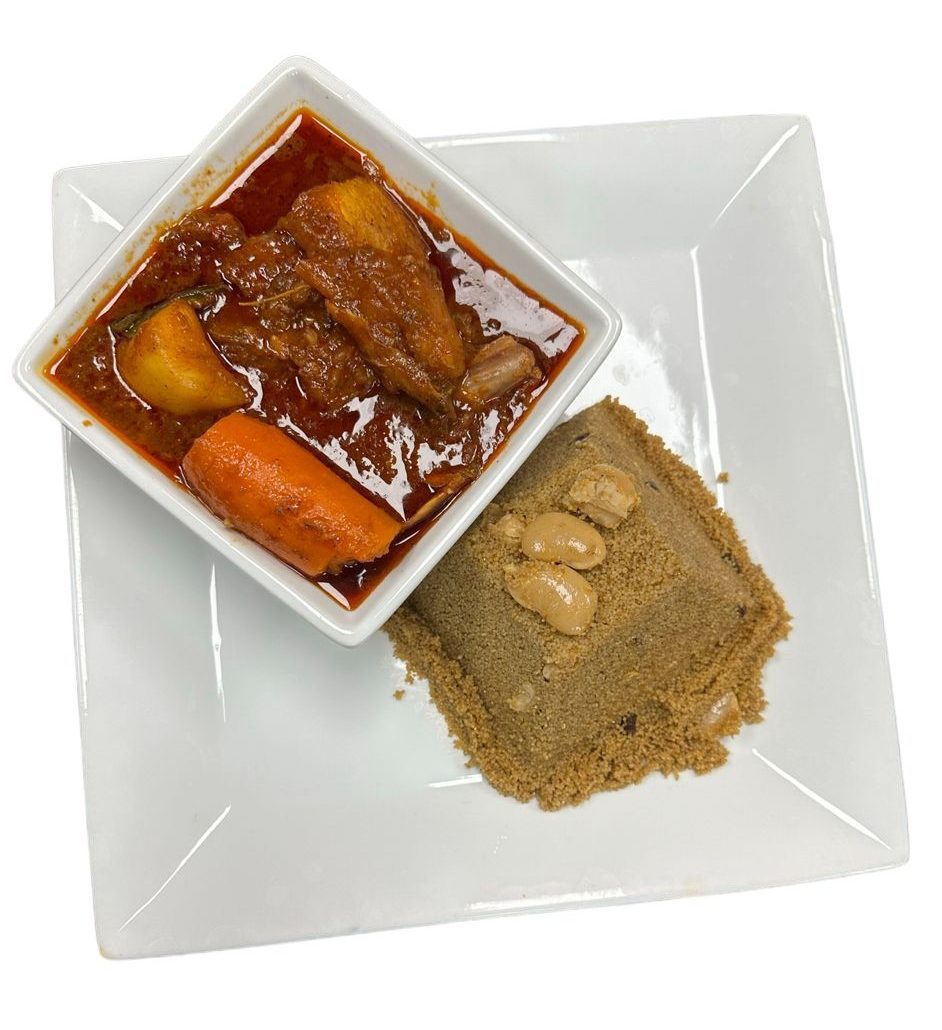 Meat and vegetable in a rich tomato sauce served with Senegalese couscous.