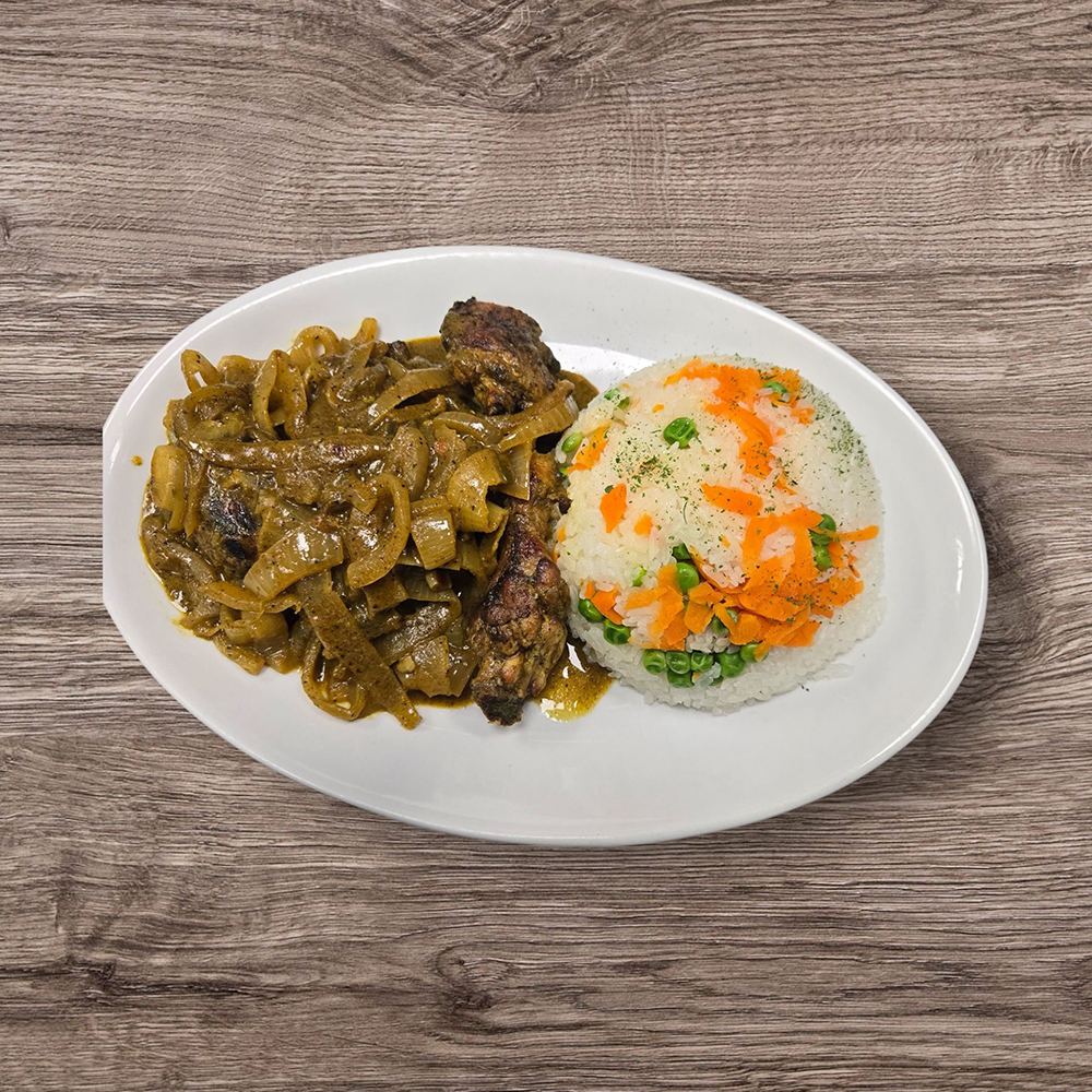 Marinated grilled Chicken in onion and lemon sauce served with white rice.
